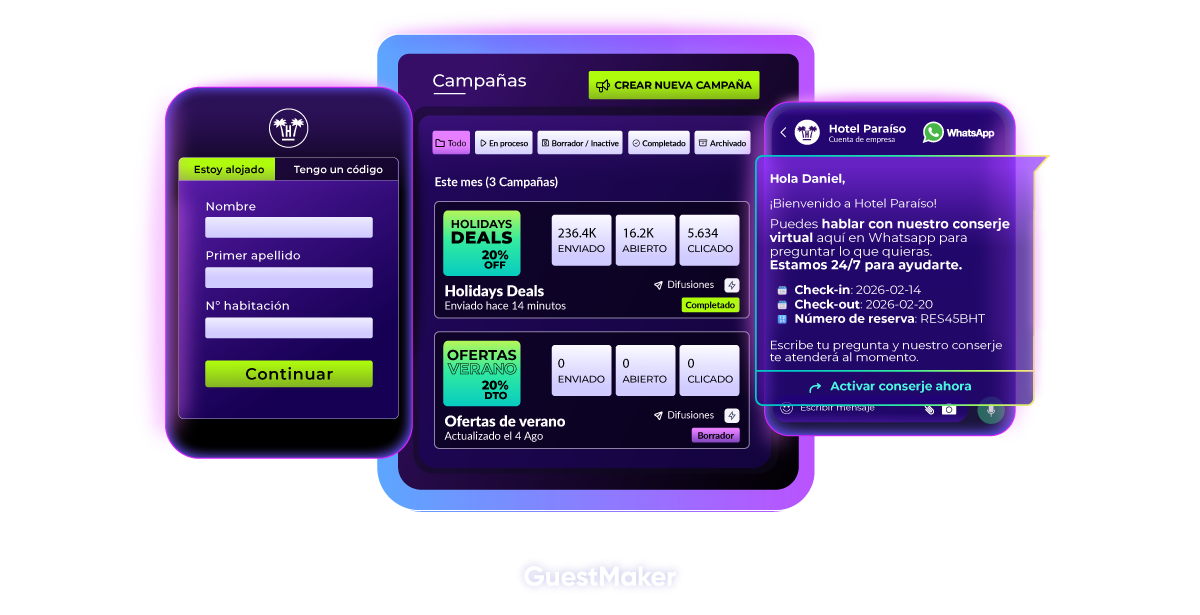 Unifica PMS, motores de reserva, apps de huésped, chatbots, programas de fidelización y portales cautivos WiFi para impulsar tus campañas de marketing antes, durante y después de la estancia. Mejora la relación con tus huéspedes y genera más reservas.Más información -