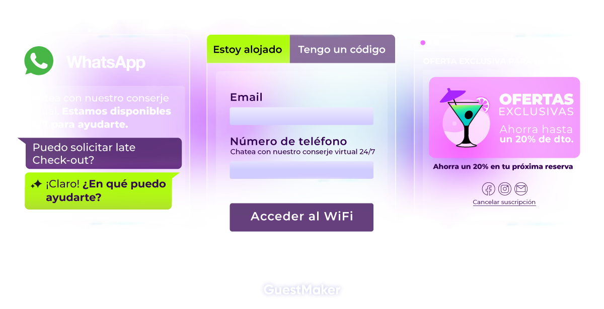 Unifica PMS, motores de reserva, apps de huésped, chatbots, programas de fidelización y portales cautivos WiFi para impulsar tus campañas de marketing antes, durante y después de la estancia. Mejora la relación con tus huéspedes y genera más reservas.Más información -