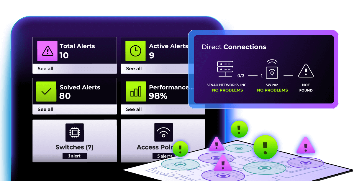 Track the health of Access Points, Switches, and other devices from any vendor, with KPIs, strength metrics, and an active device map for all areas of the hotel.