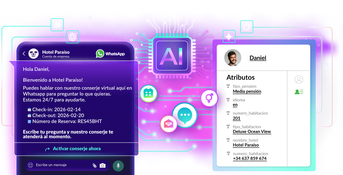 Gestiona la comunicación con los huéspedes a gran escala sin perder el control. Automatiza puntos de contacto clave en WhatsApp mientras la IA atiende consultas de forma inmediata, reduciendo la carga operativa y mejorando la satisfacción antes, durante y después de la estancia.