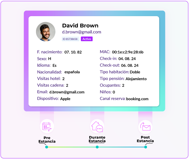 Cada interacción por email, WhatsApp o WiFi se integra en un perfil único del huésped, que se enriquece de forma continua. Más allá de la comunicación multicanal, GuestMaker asegura el uso de datos de huéspedes fiables y de alta calidad, capturados y verificados en tiempo real.