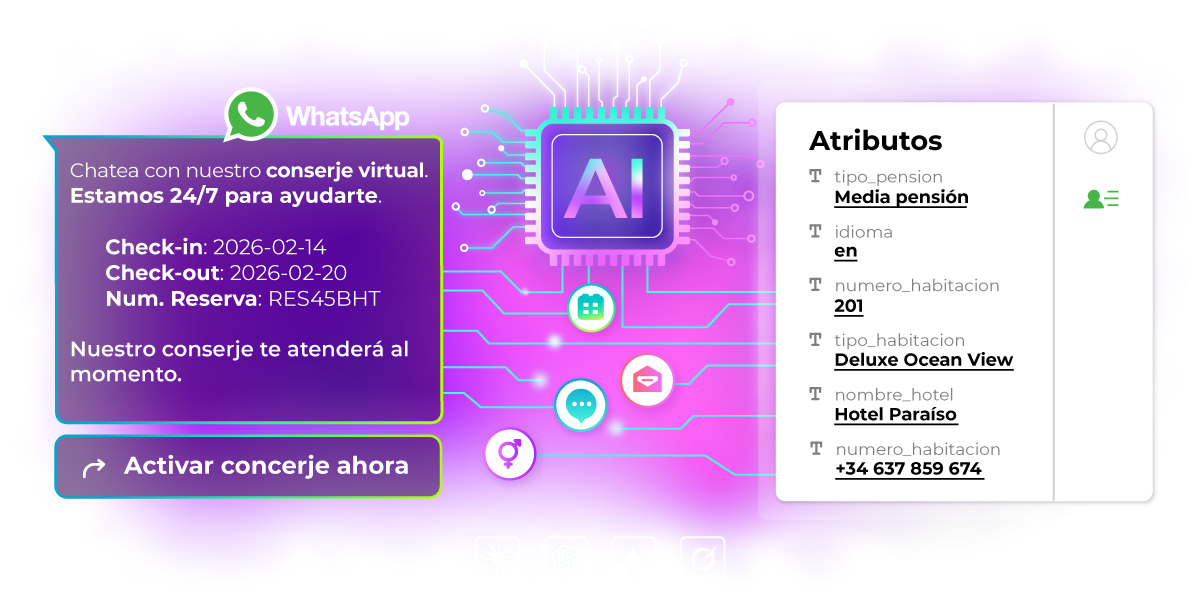 La IA comprende la información de la reserva (fechas, huéspedes, habitación), preferencias, accesos WiFi, conversaciones previas y el momento de la estancia |