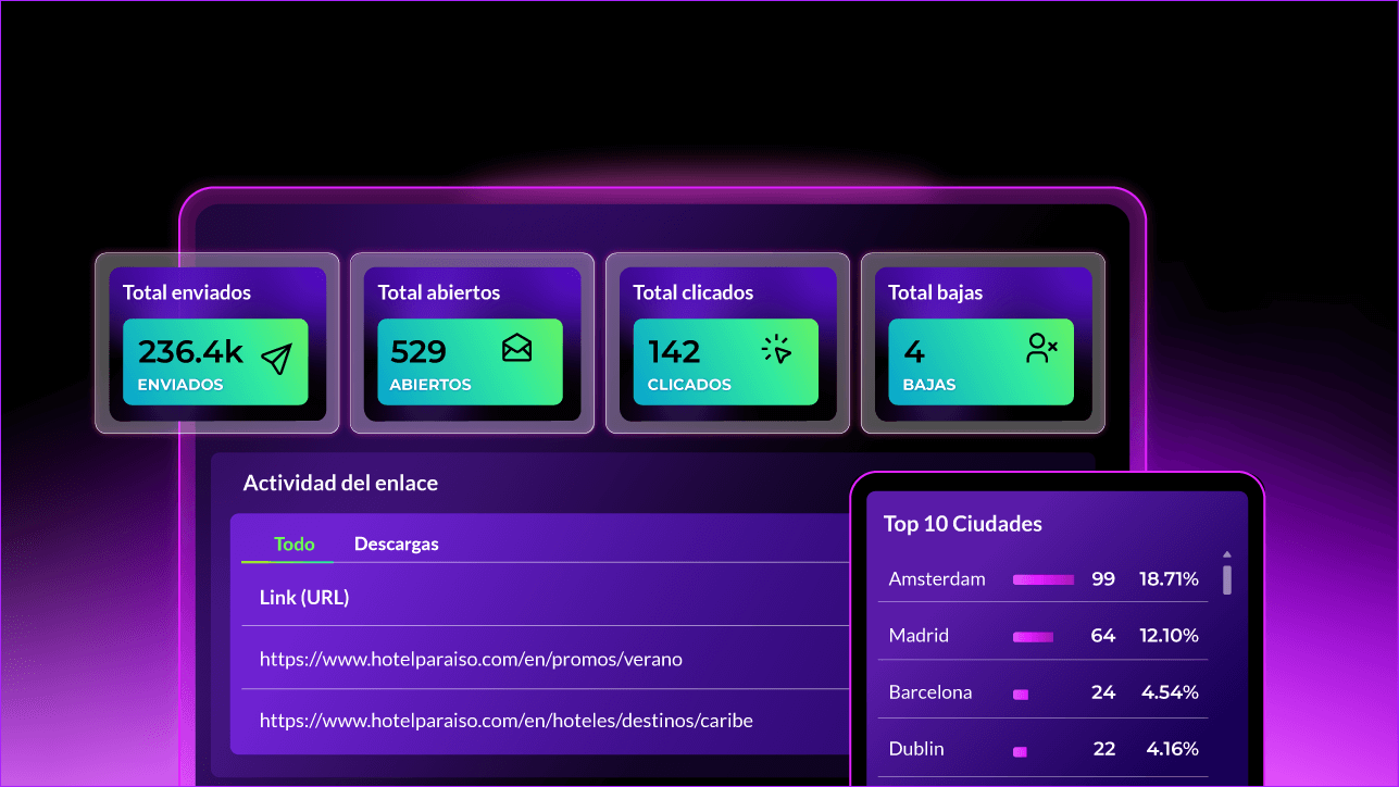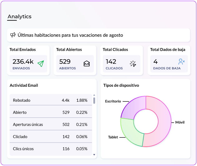 Una visión clara del estado de tus campañas. Obtén una instantánea inmediata de la actividad total, emails enviados, aperturas, clics y bajas, con indicadores visuales diseñados para comprender el rendimiento en un sólo vistazo.