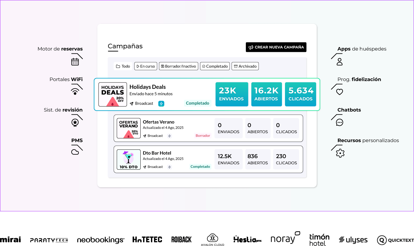 Unifica PMS, motores de reserva, apps de huésped, chatbots, programas de fidelización y portales cautivos WiFi para impulsar tus campañas de marketing antes, durante y después de la estancia. Mejora la relación con tus huéspedes y genera más reservas.