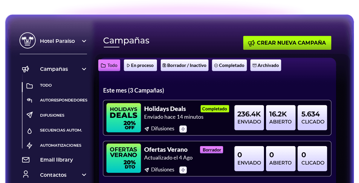 La arquitectura multipropiedad admite hoteles, marcas y usuarios ilimitados. Paga solo por el volumen de emails, no por número de contactos.