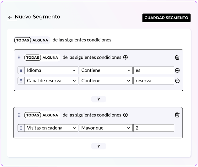 Crea y reutiliza tantos segmentos como necesites entre todos tus hoteles y tus diferentes marcas, sin ningún límite ni ninguna restricción, permitiendo una personalización infinita a gran escala.